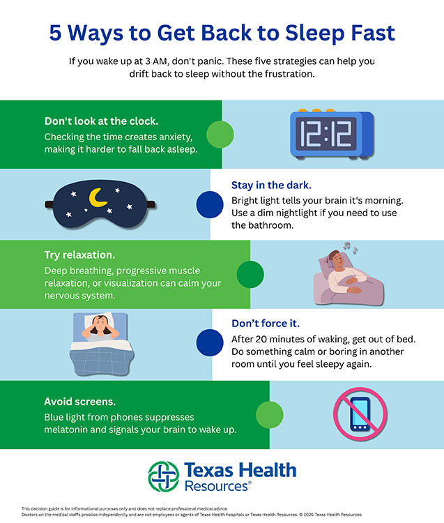 Your Texas Health primary care physician can help identify whether your nighttime awakenings are caused by stress, anxiety, medication side effects, or underlying health conditions. If a sleep disorder is suspected, your doctor can refer you to a sleep specialist for further evaluation and testing.